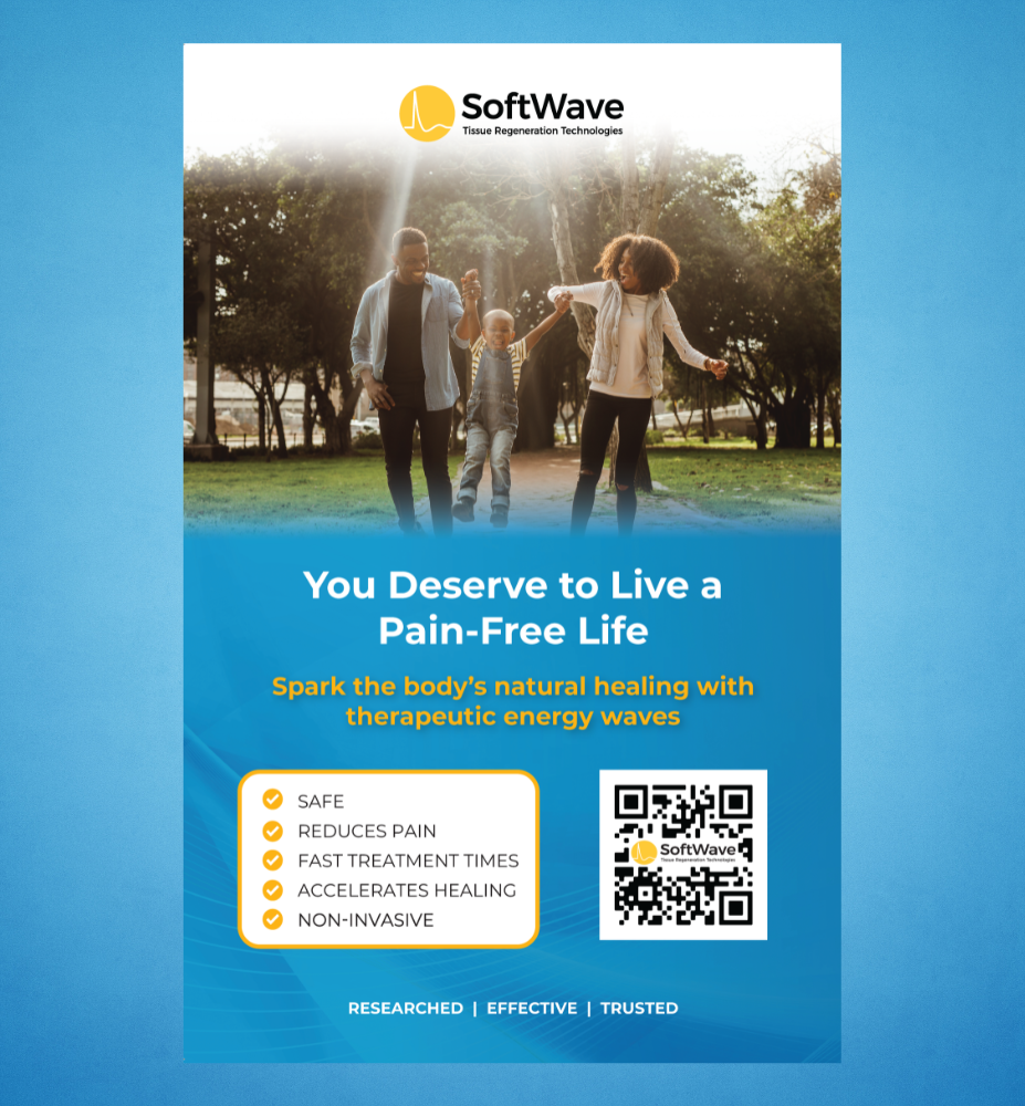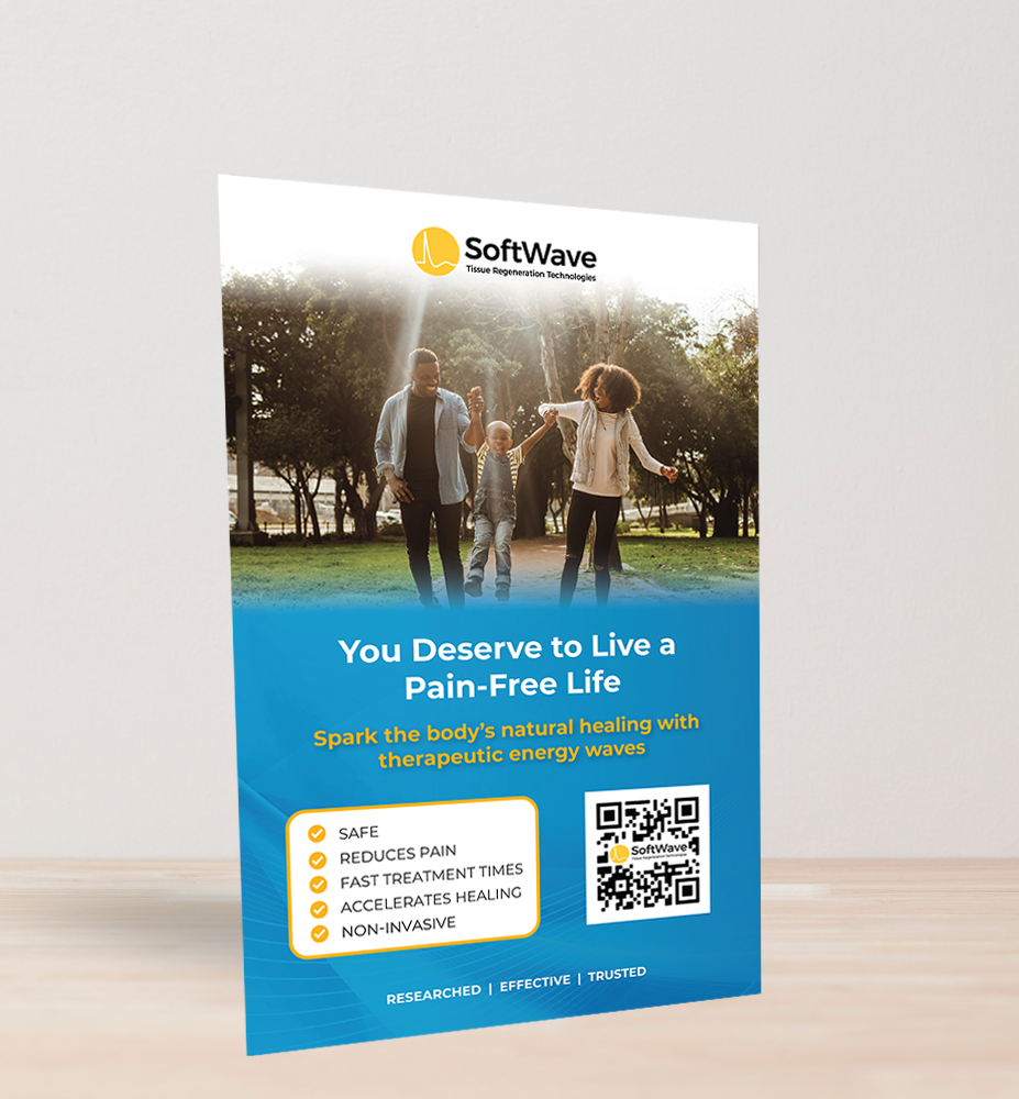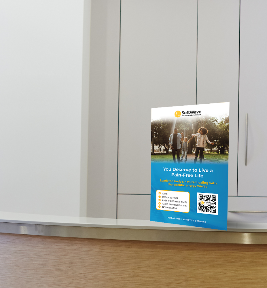 Catch the eye of your patients with our 11 x 17 poster, printed on premium 16pt coated cover stock and mounted to a collapsible stand for easy display on countertops. This one-sided poster features a sophisticated design showcasing the innovative SoftWave medical device. It's an ideal choice for medical offices looking to promote their new SoftWave device treatments. This poster is not just a marketing tool, but a visual statement of your commitment to cutting-edge healthcare. Encourage your patients to inquire about SoftWave treatments and demonstrate your practice's dedication to advanced medical technology with this elegant and informative wall display.