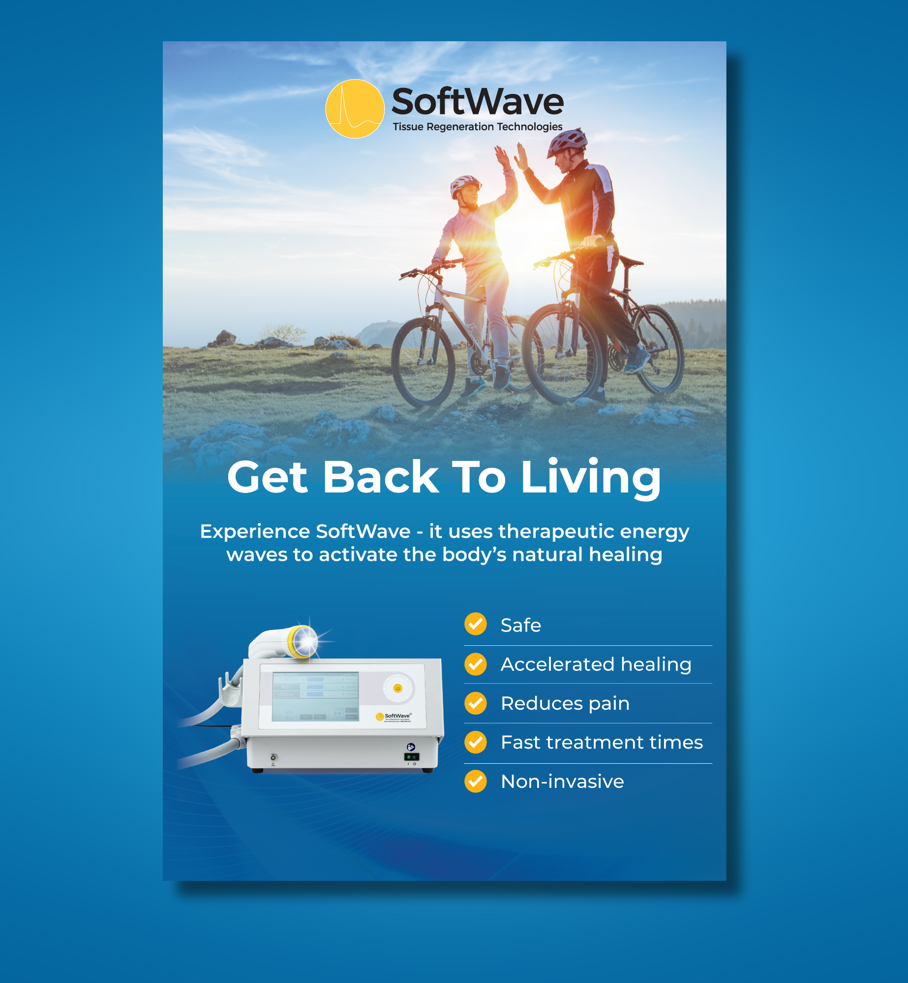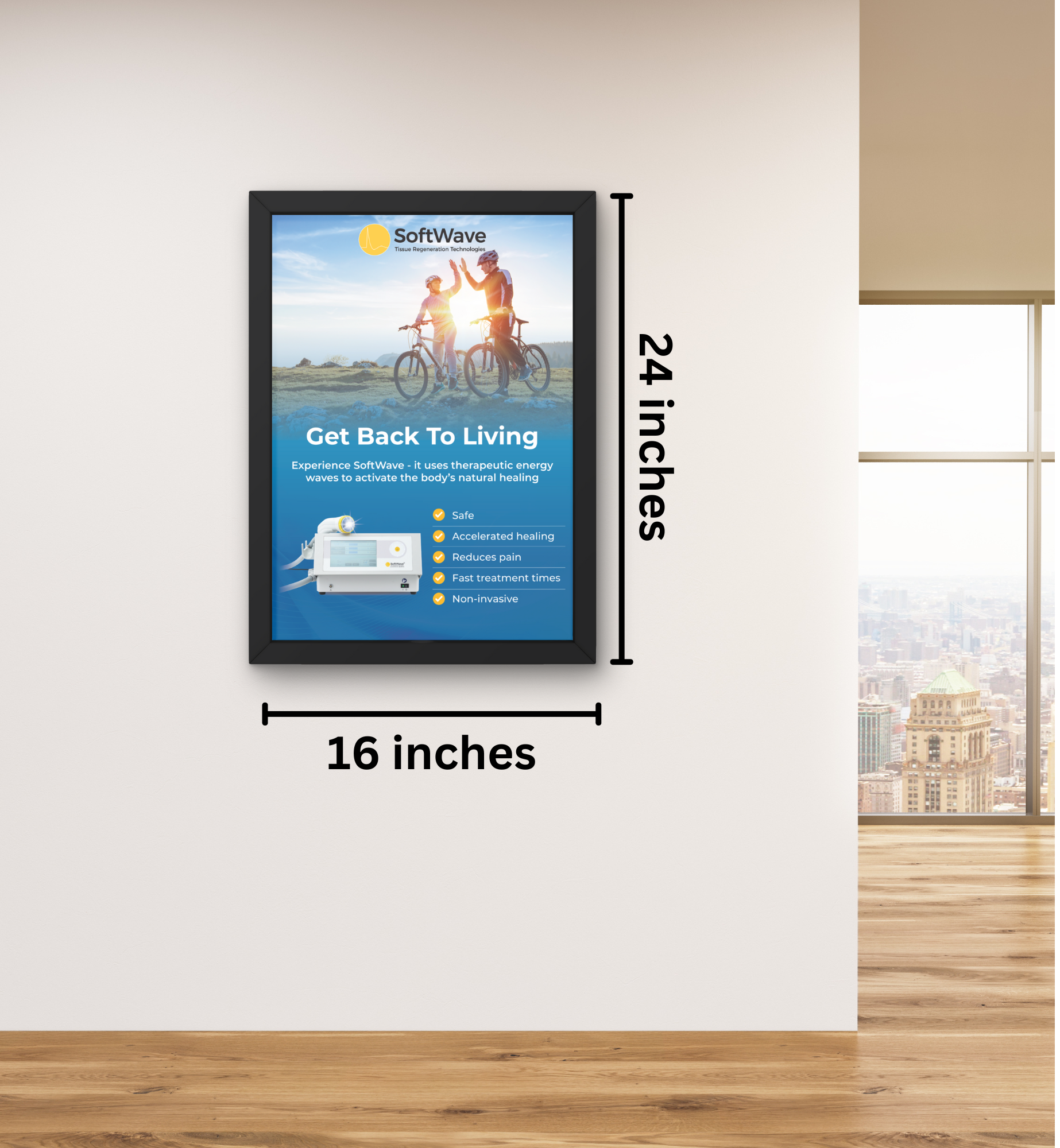 Catch the eye of your patients with our 16 x 24 wall poster, printed on premium 16pt gloss paper for a striking finish. This one-sided poster features a sophisticated design showcasing the innovative SoftWave medical device. It's an ideal choice for medical offices looking to promote their new SoftWave device treatments. This poster is not just a marketing tool, but a visual statement of your commitment to cutting-edge healthcare. Encourage your patients to inquire about SoftWave treatments and demonstrate your practice's dedication to advanced medical technology with this elegant and informative wall display.