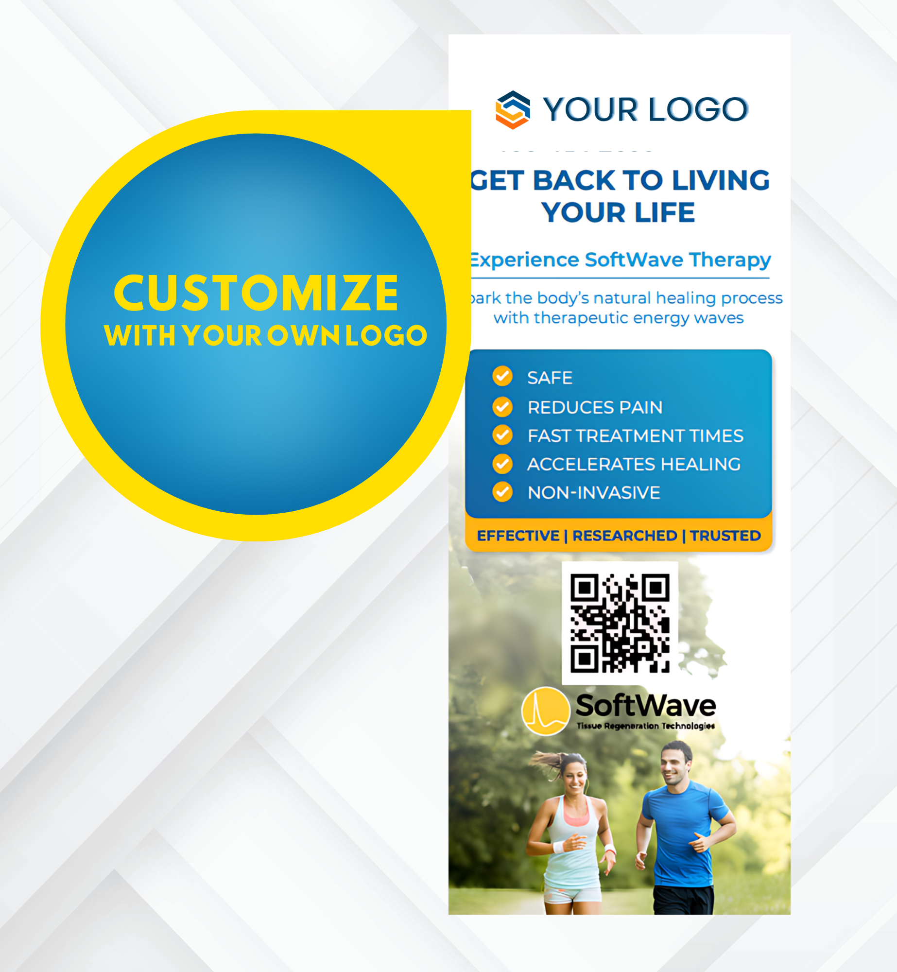 This product features the message: "Get Back to Living Your Life: Experience SoftWave Therapy," a designated space at the top for your own logo, and a list of product features.