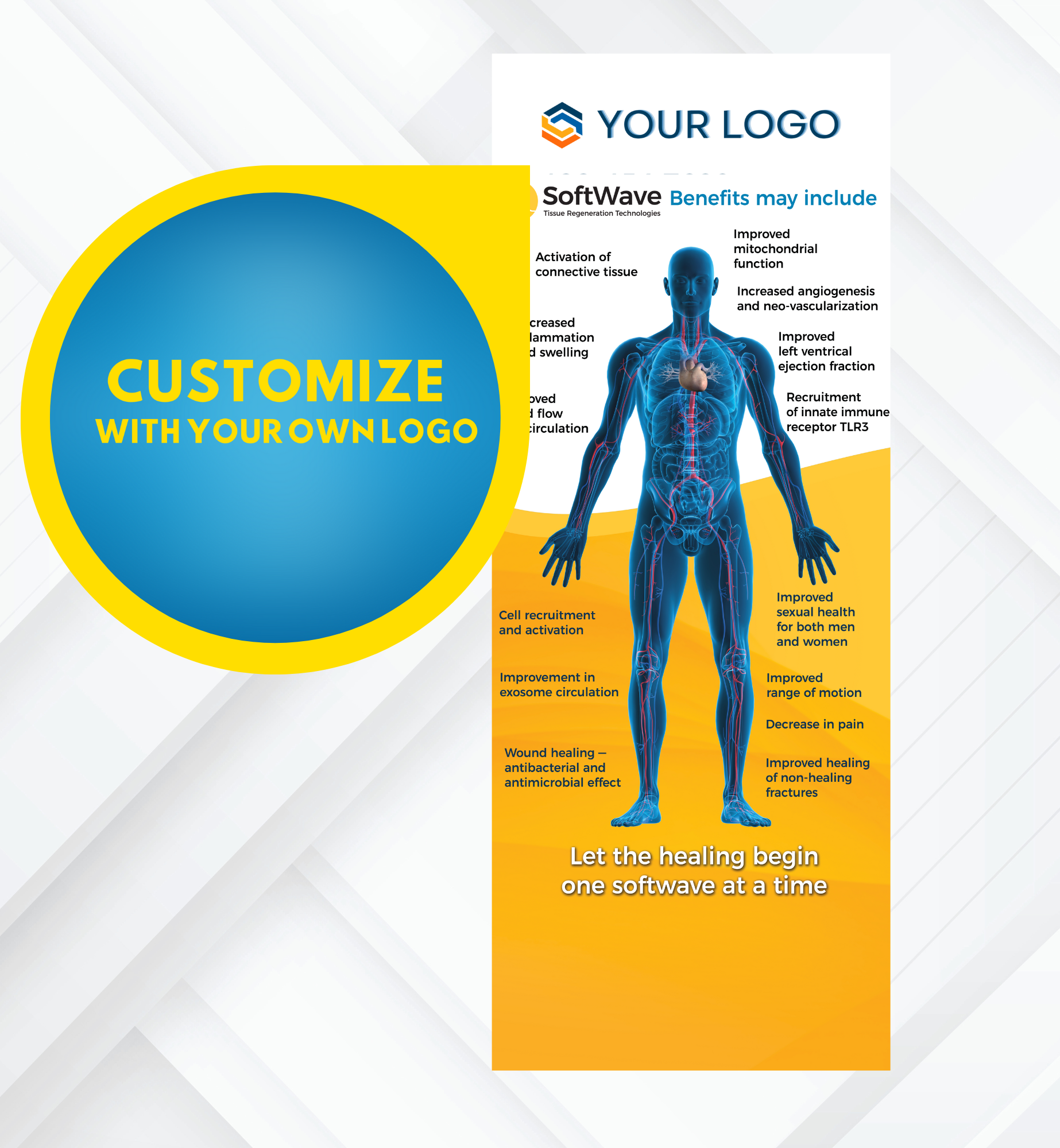 This product features the message: "Let the healing begin one SoftWave at a time," a designated space for your clinic logo at the top, and a captivating body illustration to bring attention to the listed benefits.