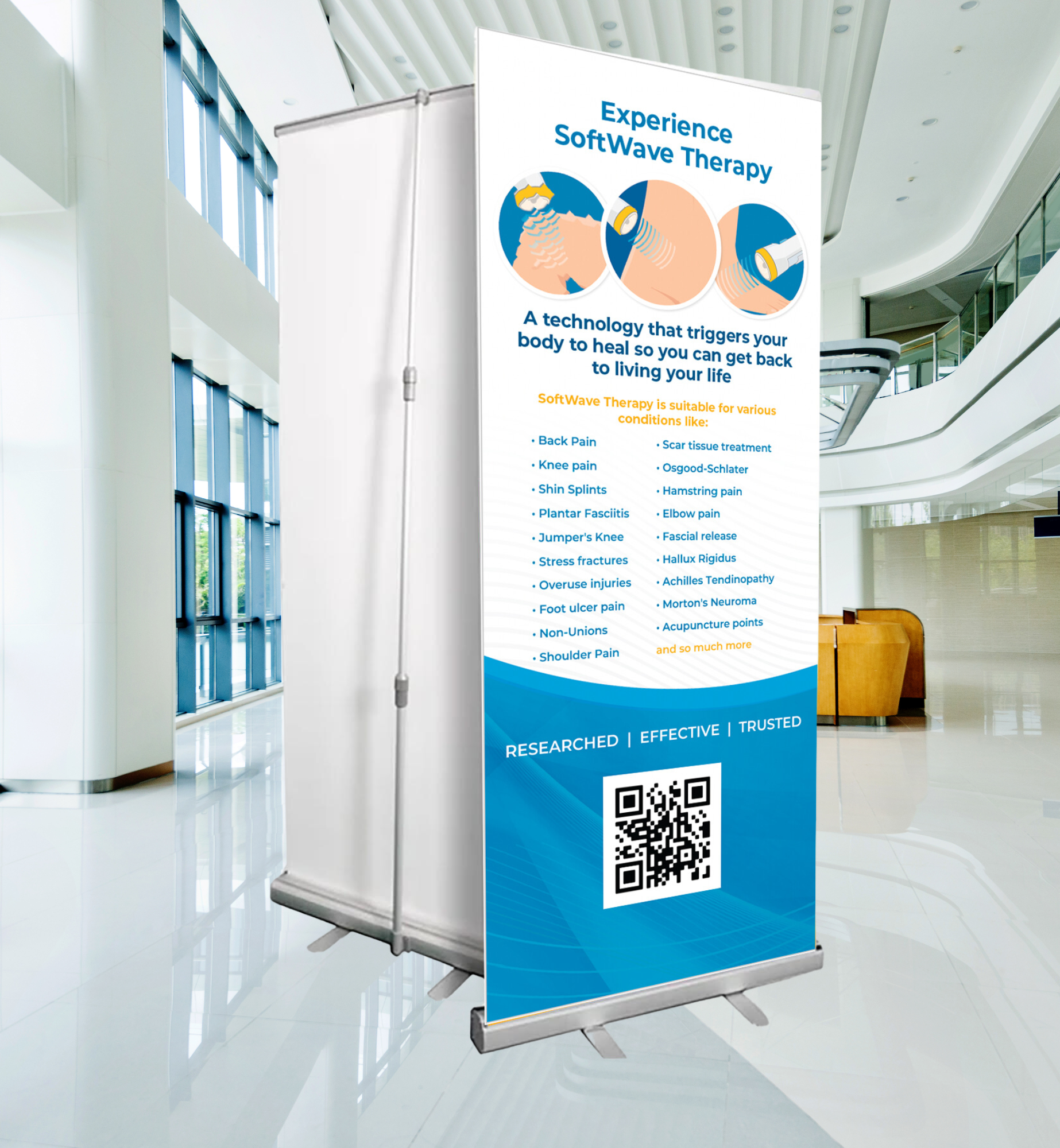 This product features the message: "Experience SoftWave Therapy," a comprehensive list of treatable conditions, and an informational QR code. This banner will appear as seen in the images.