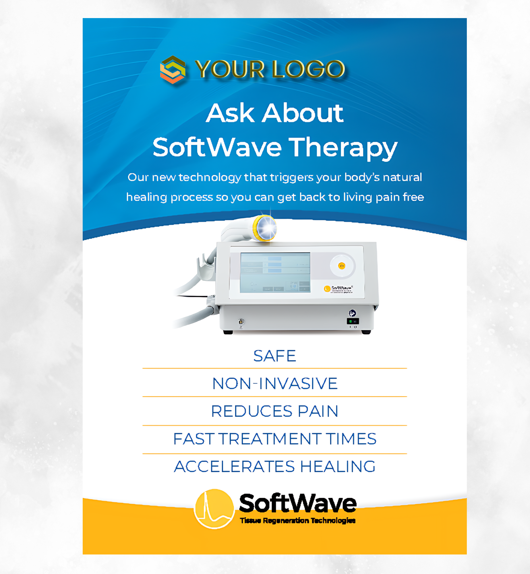 Capture attention and drive patient engagement with our premium 5x7 postcards. Printed on high-quality 100# gloss cover stock, these eye-catching cards feature a professionally designed layout showcasing the innovative SoftWave device. These postcards feature a space dedicated for your own logo.