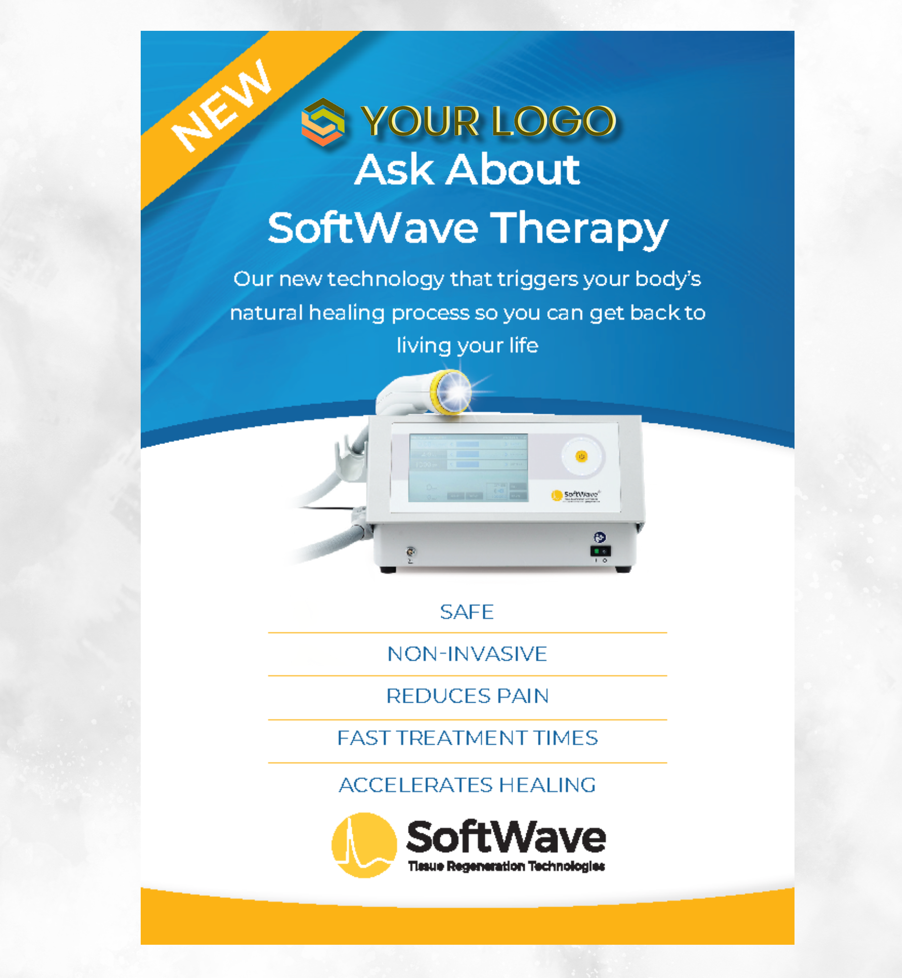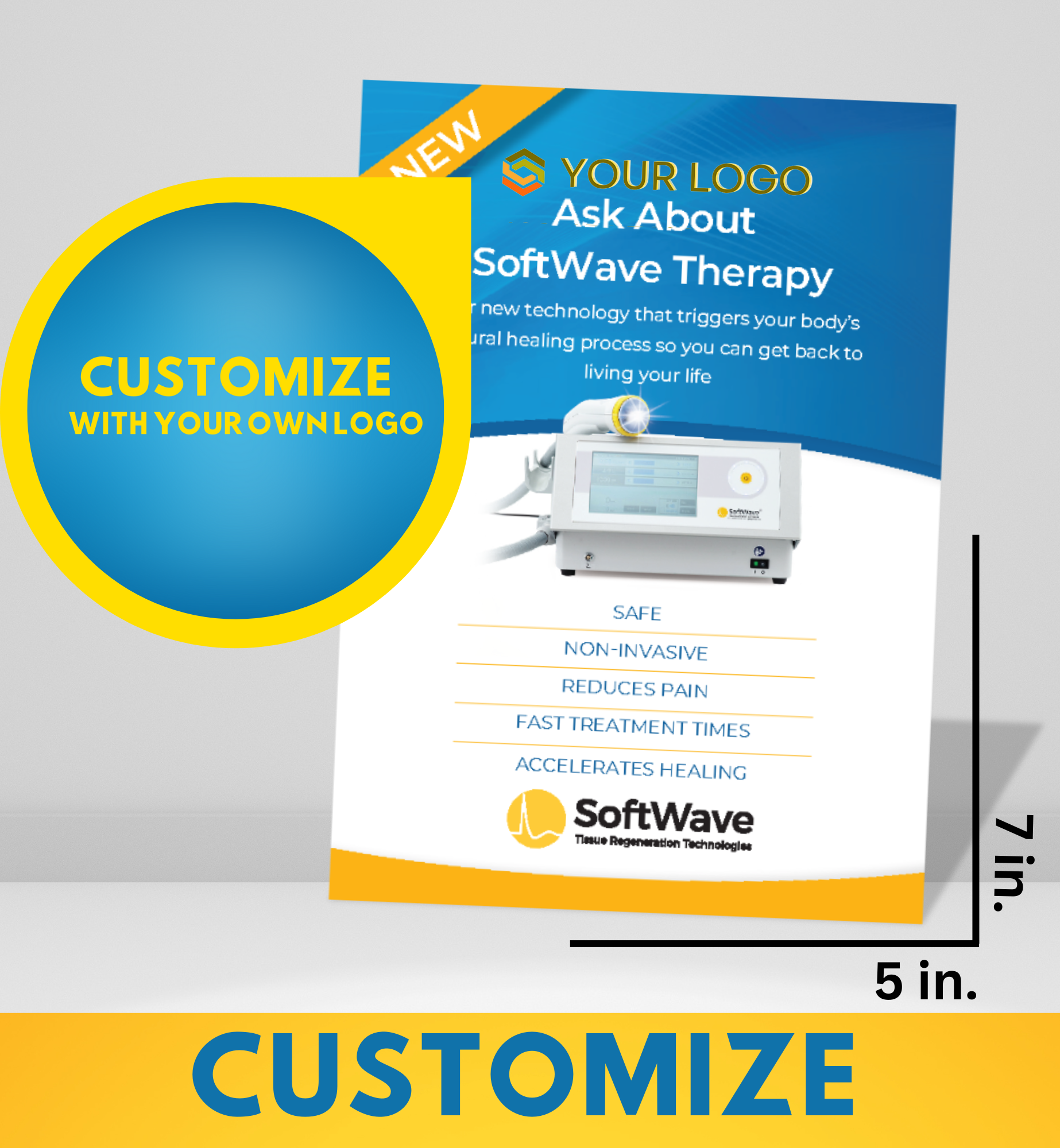 Capture attention and drive patient engagement with our premium 5x7 postcards. Printed on high-quality 100# gloss cover stock, these eye-catching cards feature a professionally designed layout showcasing the innovative SoftWave device. These postcards feature a space dedicated for your own logo.