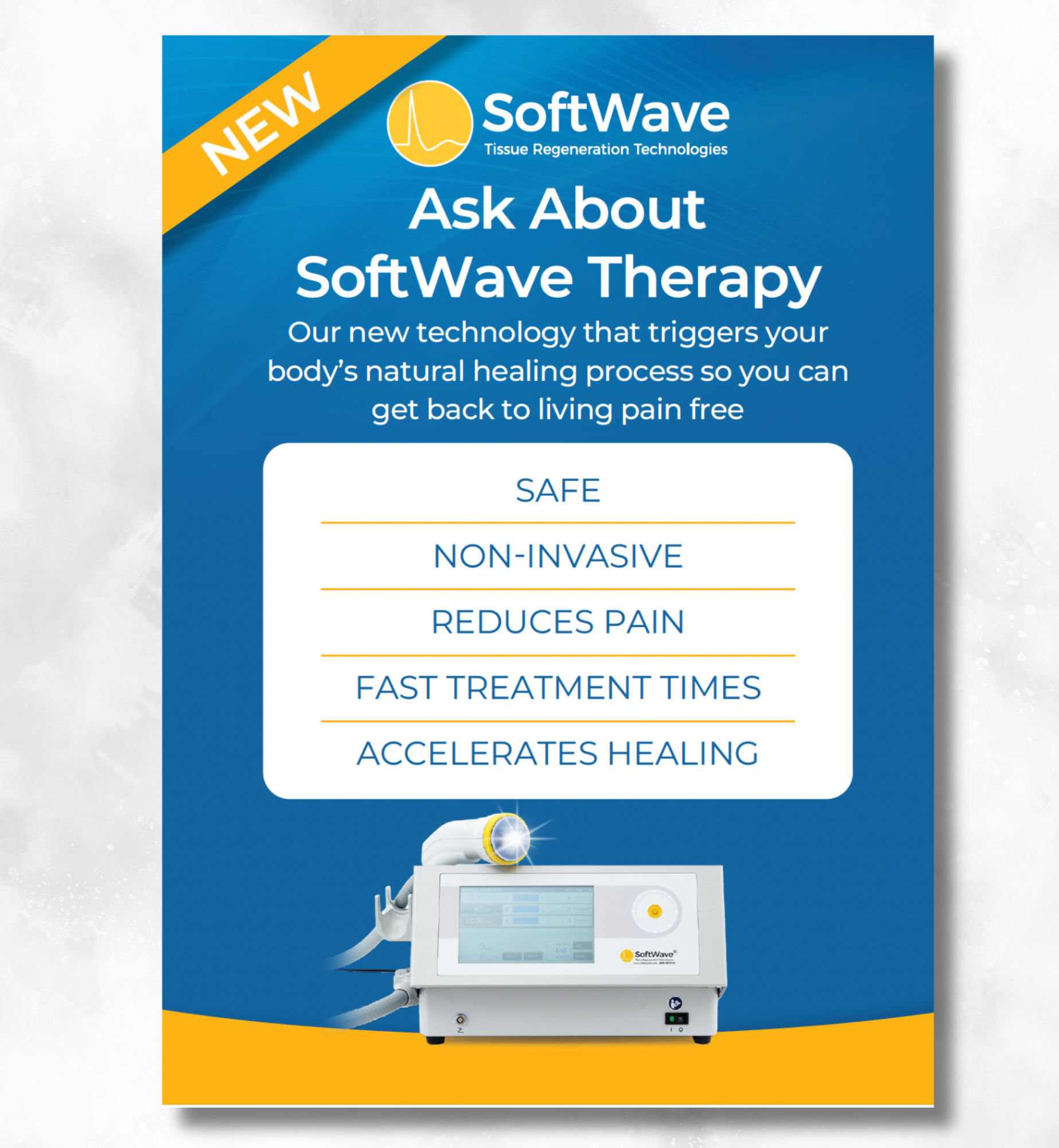 Capture attention and drive patient engagement with our premium 5x7 postcards. Printed on high-quality 100# gloss cover stock, these eye-catching cards feature a professionally designed layout showcasing the innovative SoftWave device.