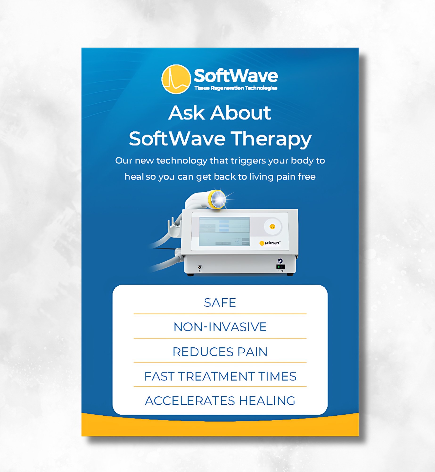 Capture attention and drive patient engagement with our premium 5x7 postcards. Printed on high-quality 100# gloss cover stock, these eye-catching cards feature a professionally designed layout showcasing the innovative SoftWave device.