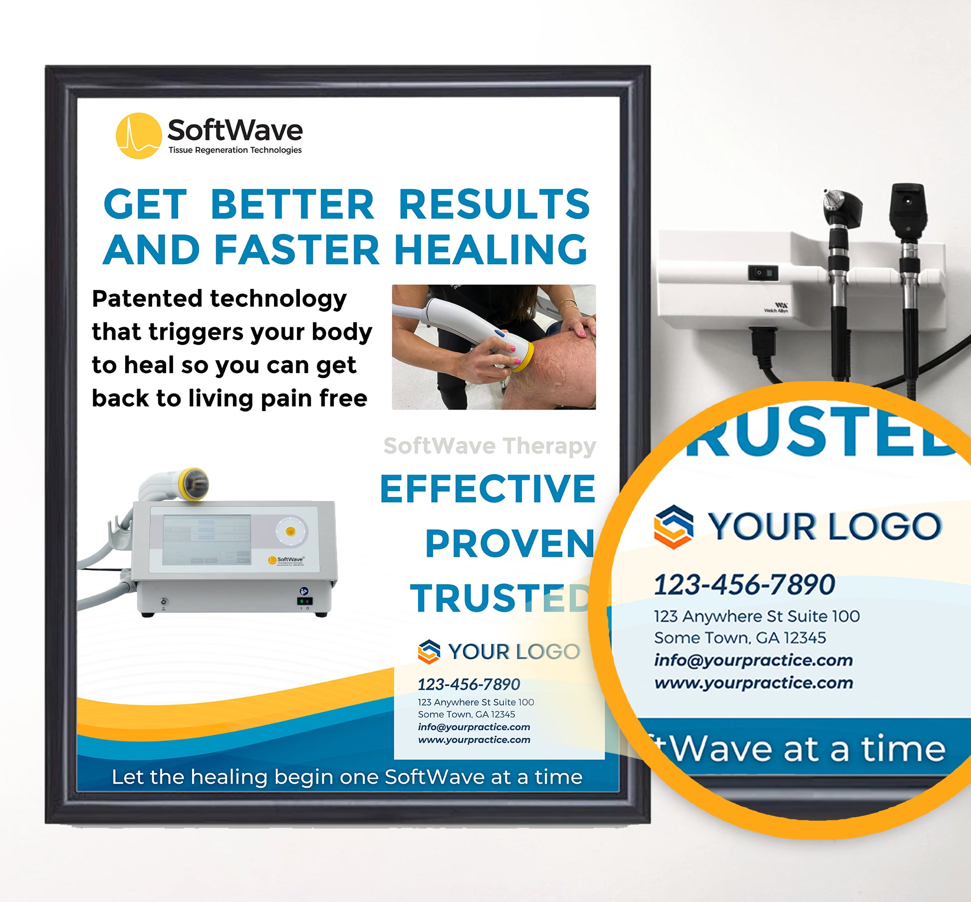 Catch the eye of your patients with our 16 x 20 wall poster, printed on premium 16pt gloss paper for a striking finish. This one-sided poster features a sophisticated design showcasing the innovative SoftWave medical device. It's an ideal choice for medical offices looking to promote their new SoftWave device treatments. This poster is not just a marketing tool, but a visual statement of your commitment to cutting-edge healthcare. Encourage your patients to inquire about SoftWave treatments and demonstrate your practice's dedication to advanced medical technology with this elegant and informative wall display.