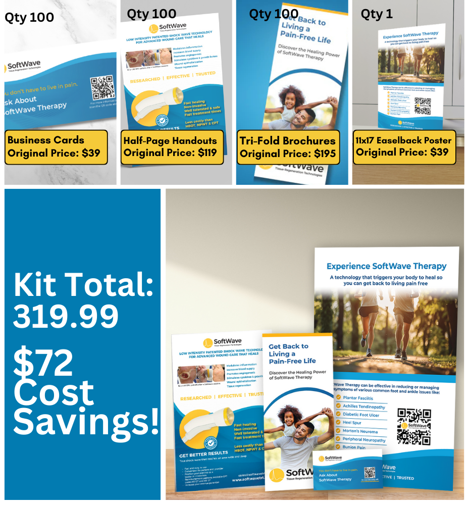 - 100 Tri-fold Brochures: Brochures are one of the most requested patient information tools, and "Get Back to Living a Pain-Free Life" is one of the most requested brochures. This brochure, printed on 100# gloss text, provides information on how Softwave can help patients recover faster.