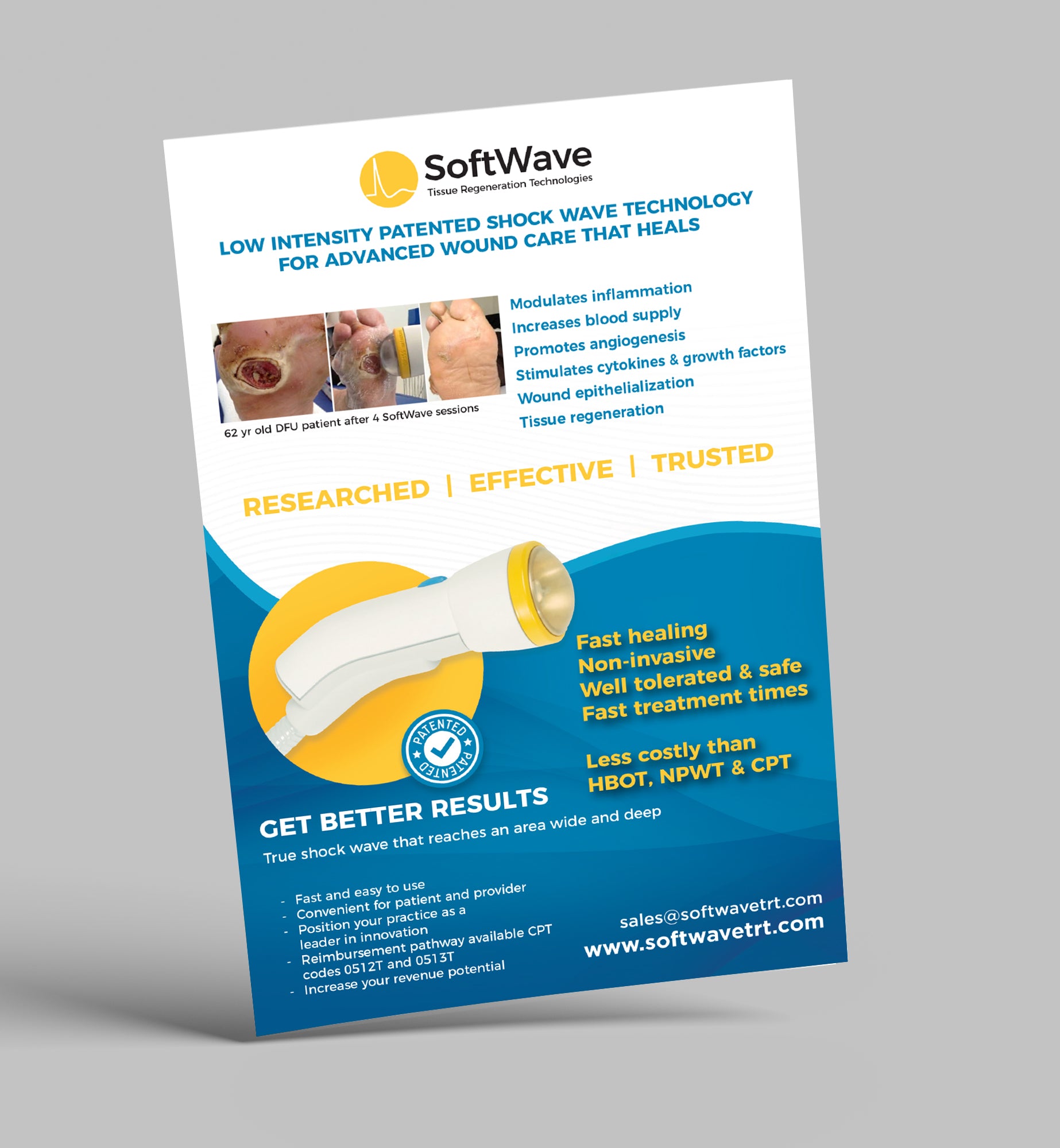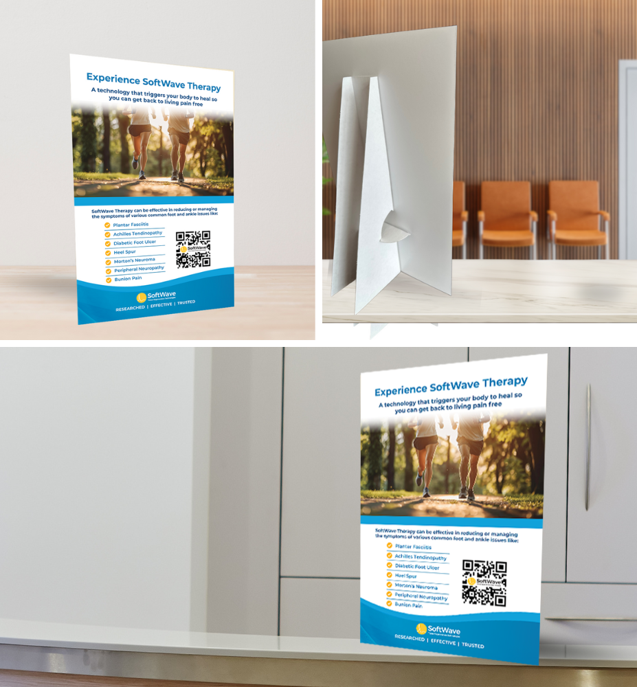 - 11"x17" Poster with Easel-back: Printed on premium, 16pt cardstock, this poster can be set out to inform patients of the benefits of Softwave for common injuries and conditions in foot and ankle care.