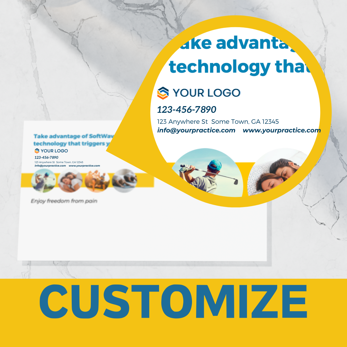 Boost patient engagement with our premium 4 x 6 postcards, printed on high-quality 100# Gloss cover stock for a professional finish. These double-sided postcards feature pre-designed artwork that showcases the innovative SoftWave device, as a new addition to your treatment arsenal. Ideal for informing and attracting patients to your practice, these cards are a must-have to promote your practice's latest treatment offerings effectively. Elevate your marketing strategy and keep your patients informed about the cutting-edge SoftWave device treatments with these visually appealing and informative postcards.