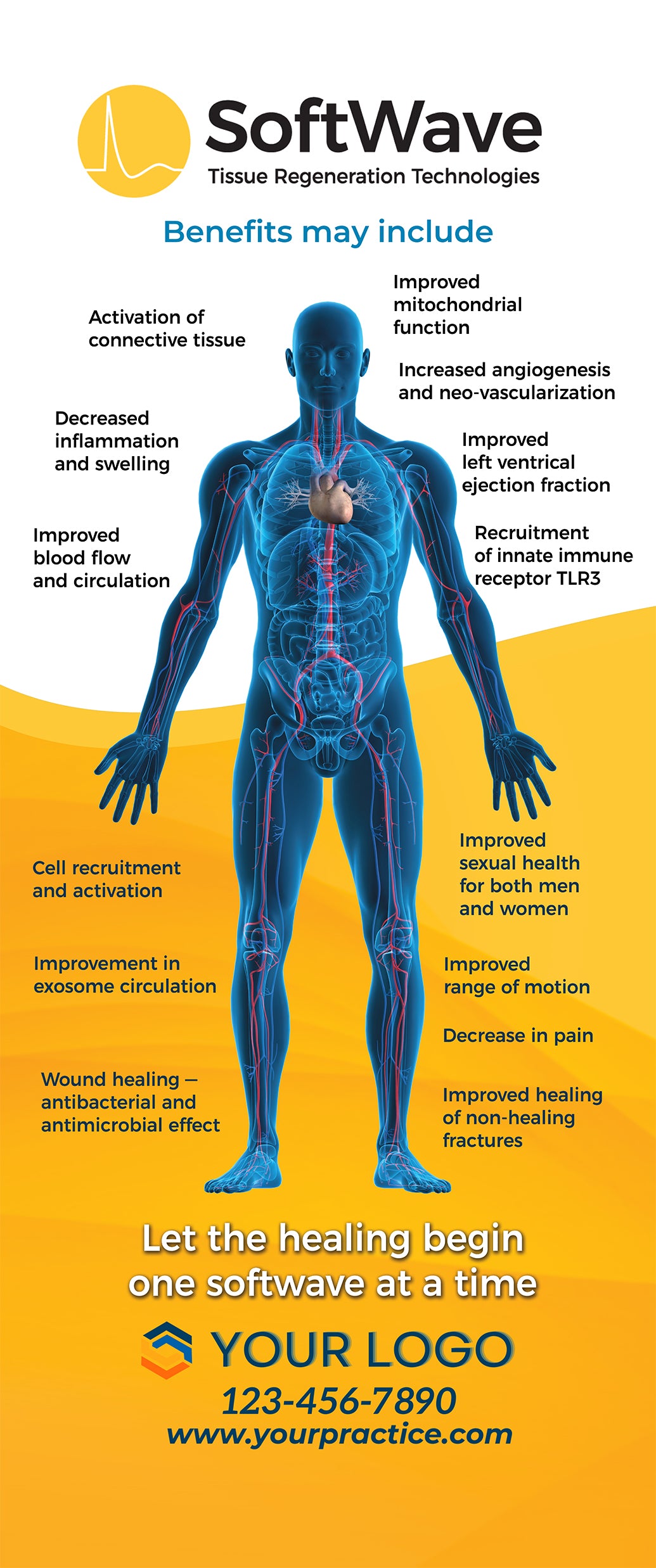 Maximize your practice's presence at events with our 34"x81" retractable banner stand, a perfect blend of convenience and impact. Designed for effortless setup, this portable banner makes an ideal traveling companion for various events, showcasing the advanced SoftWave medical device treatments your practice offers. The banner comes with a durable carry bag, ensuring ease of transport and protection. Its sleek design and striking visuals are printed on high-quality material, making it an attention-grabbing feature in any setting. Whether at conferences, health fairs, or in-office, this retractable banner stand is a must-have for effectively promoting your state-of-the-art treatment options.